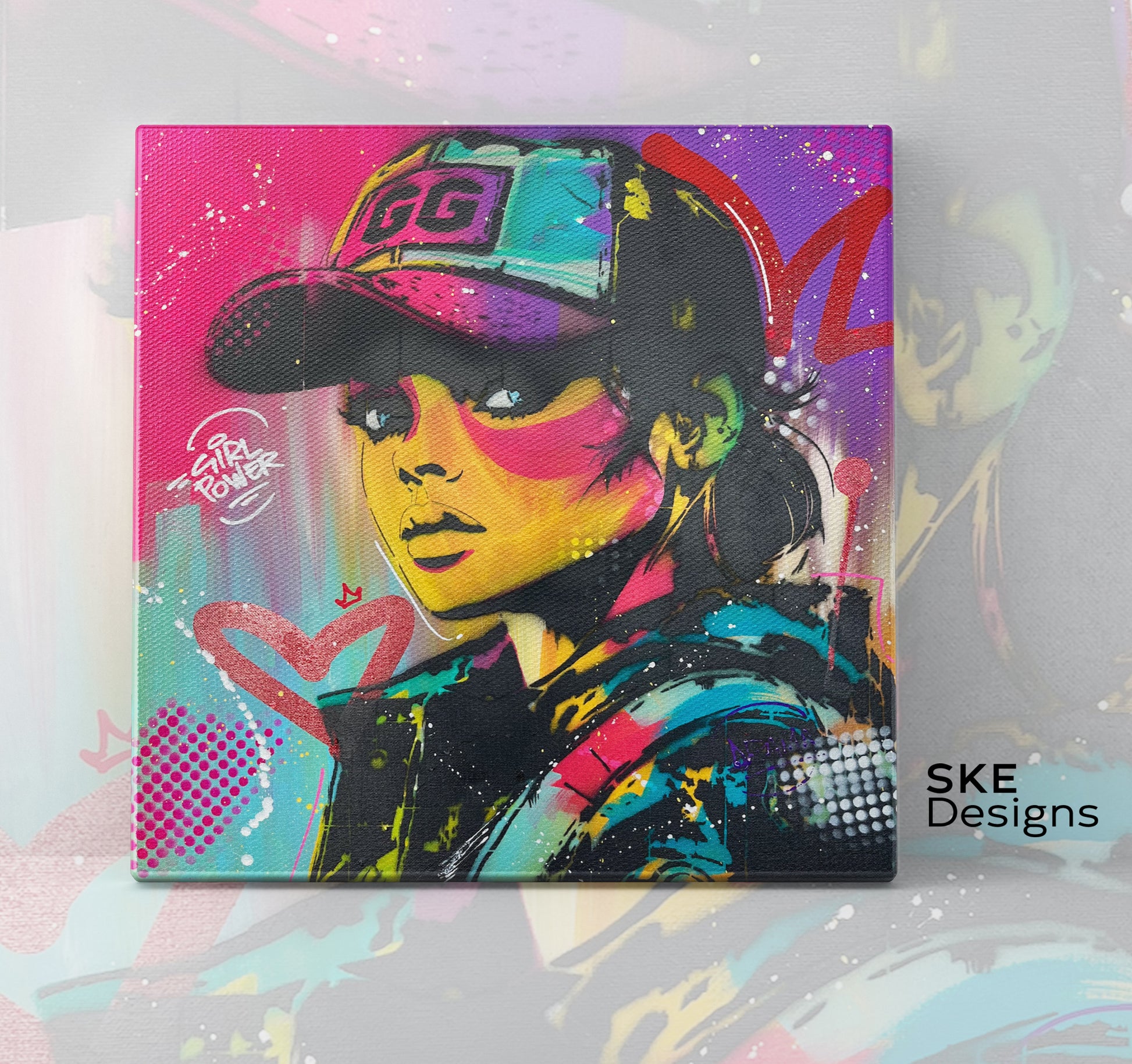 This portrait of a woman is a true fusion of pop art and graffiti styles. The vibrant colors and strong contrasts recall the pop art aesthetic, while the dynamic strokes and paint splatters evoke the energy of street art. The result: an urban and modern work of art that is sure to attract attention.