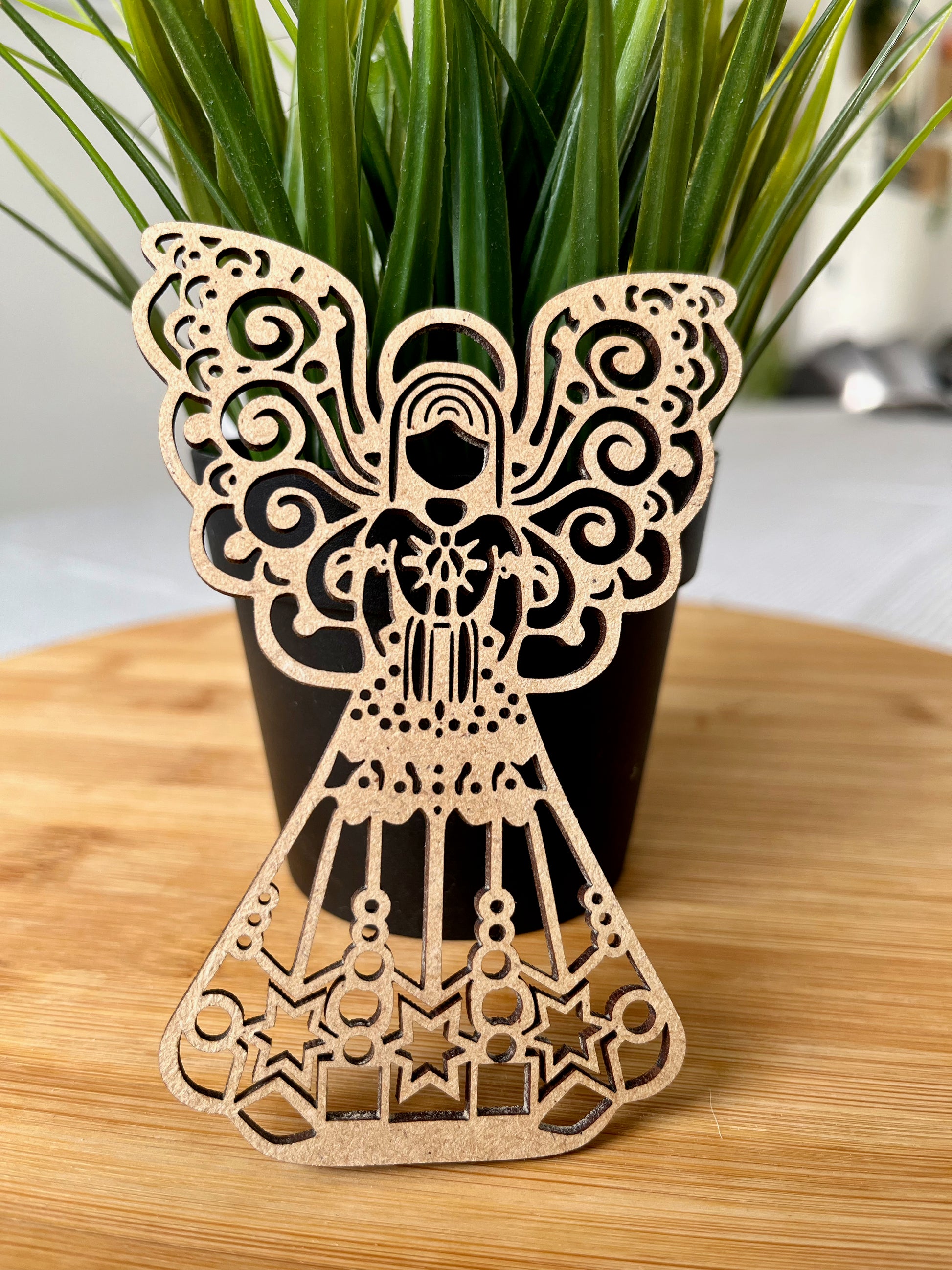 Ontdek onze delicate, lasergesneden houten engelen, perfect om een vleugje magie aan je kerstboom te geven. Licht en luchtig, ze glijden tussen je takken en creëren een magische sfeer.