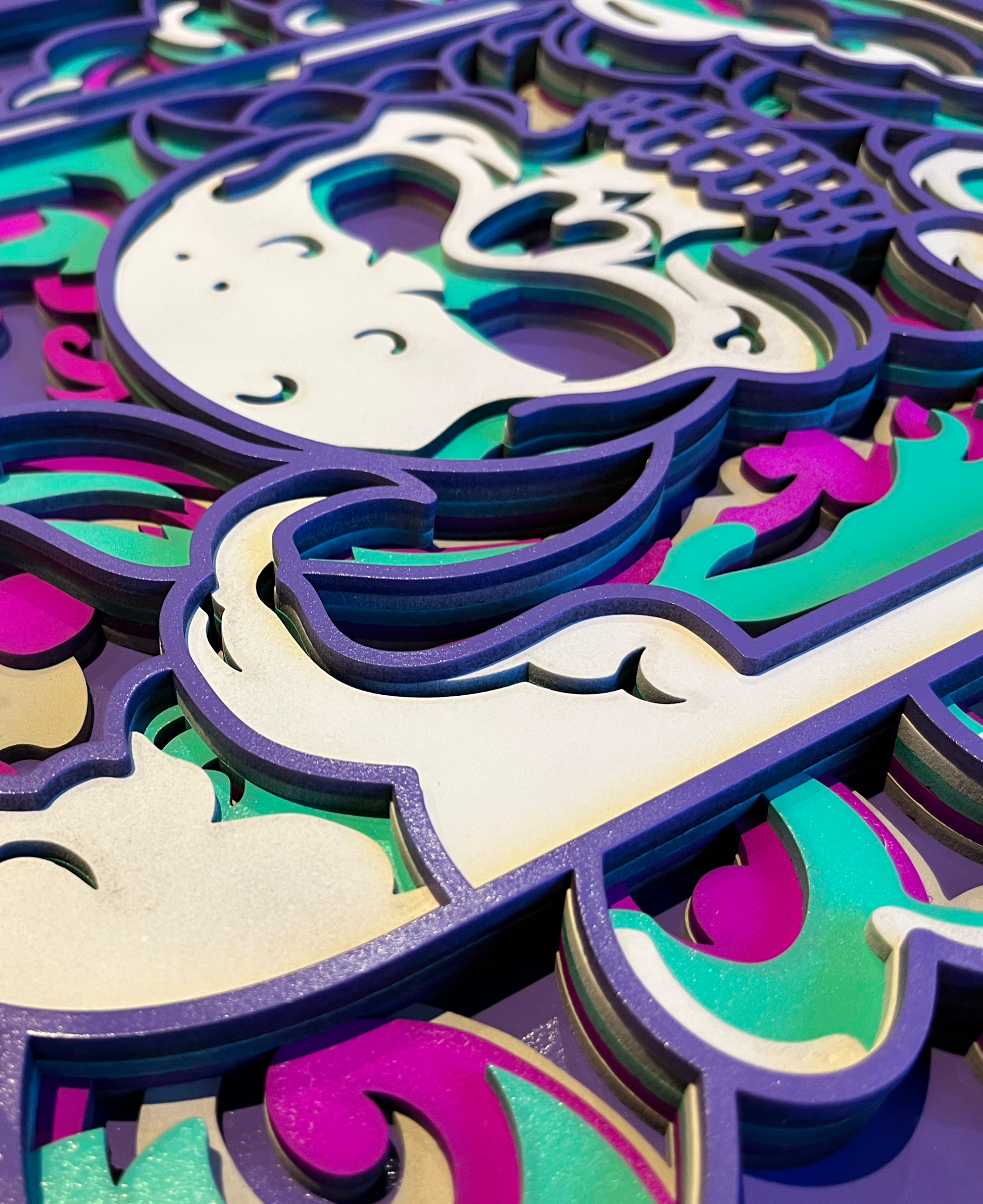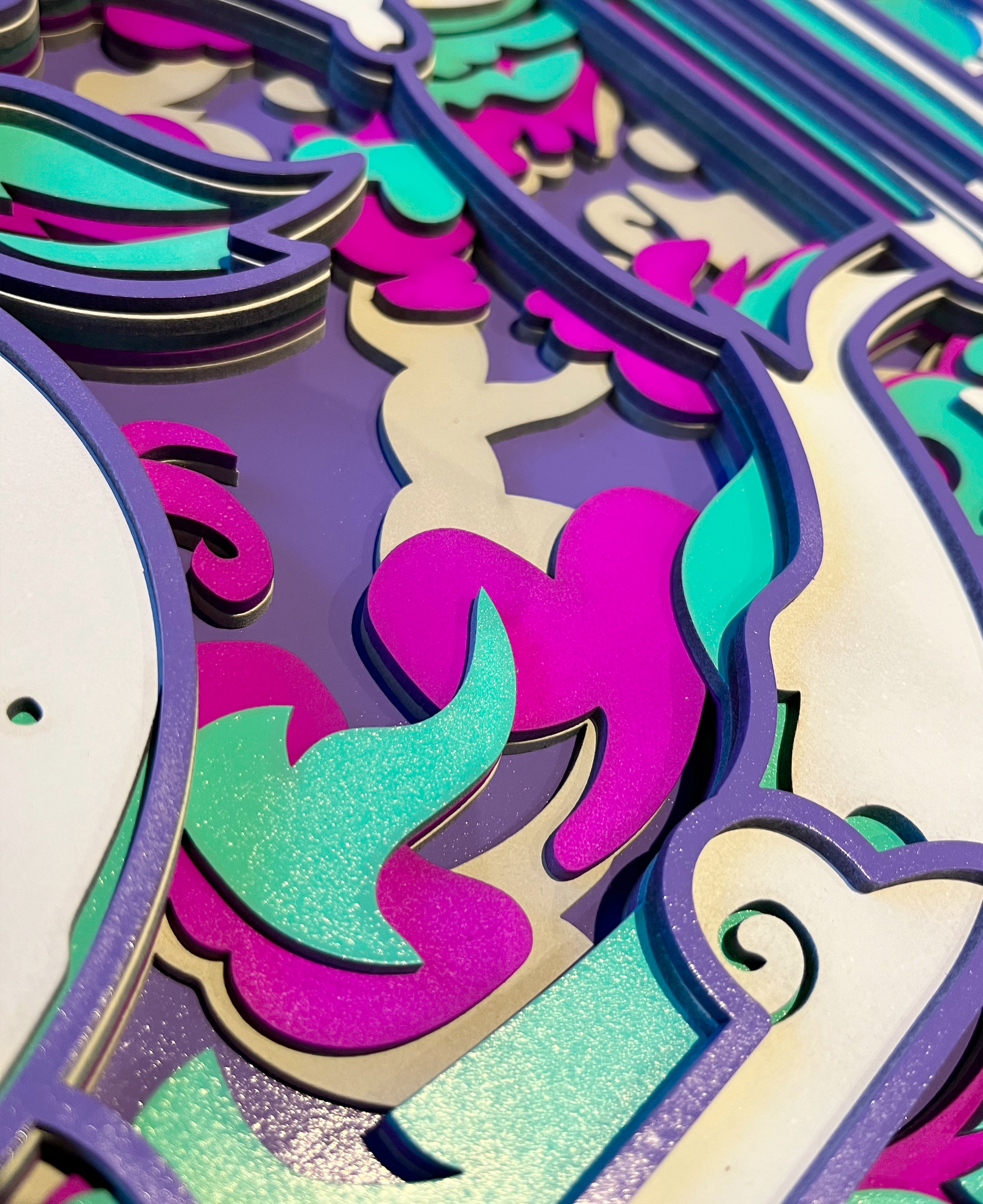 - Kleuren: magenta, violet, turkoois, mauve, lichtgrijs, wit