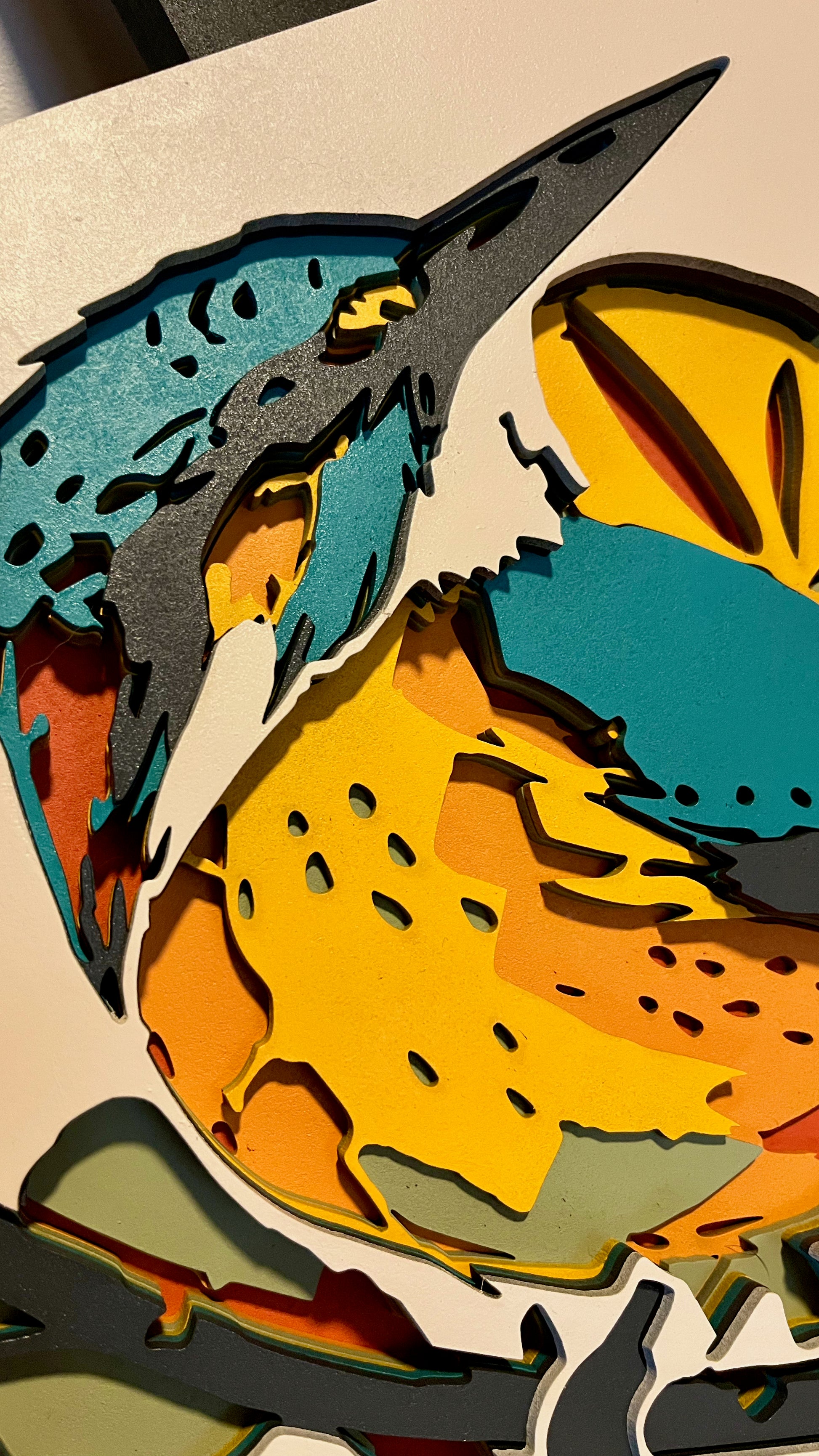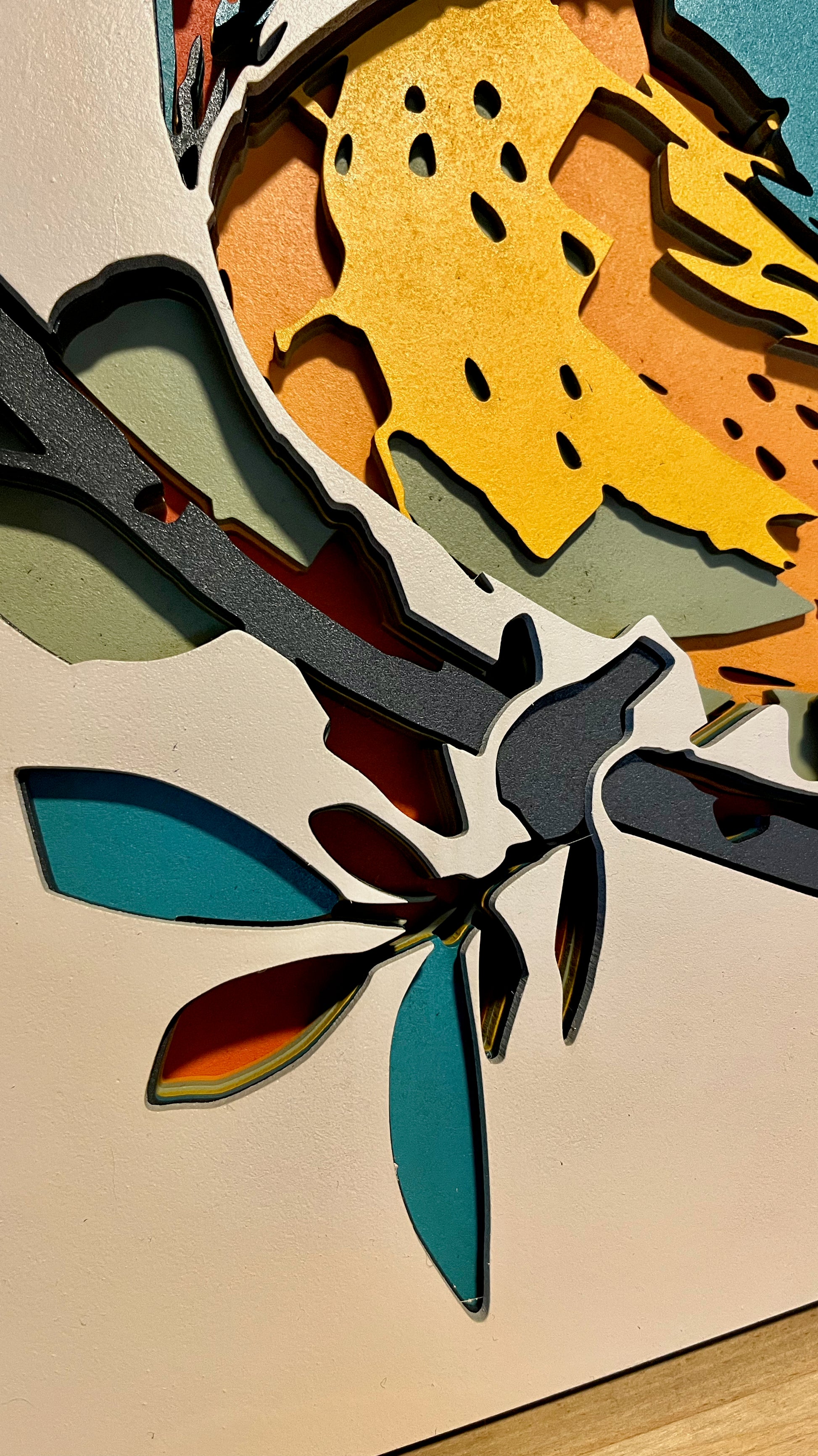 Les lignes épurées de cet oiseau se marient à merveille avec les couleurs vibrantes. Une pièce unique pour une déco contemporaine.