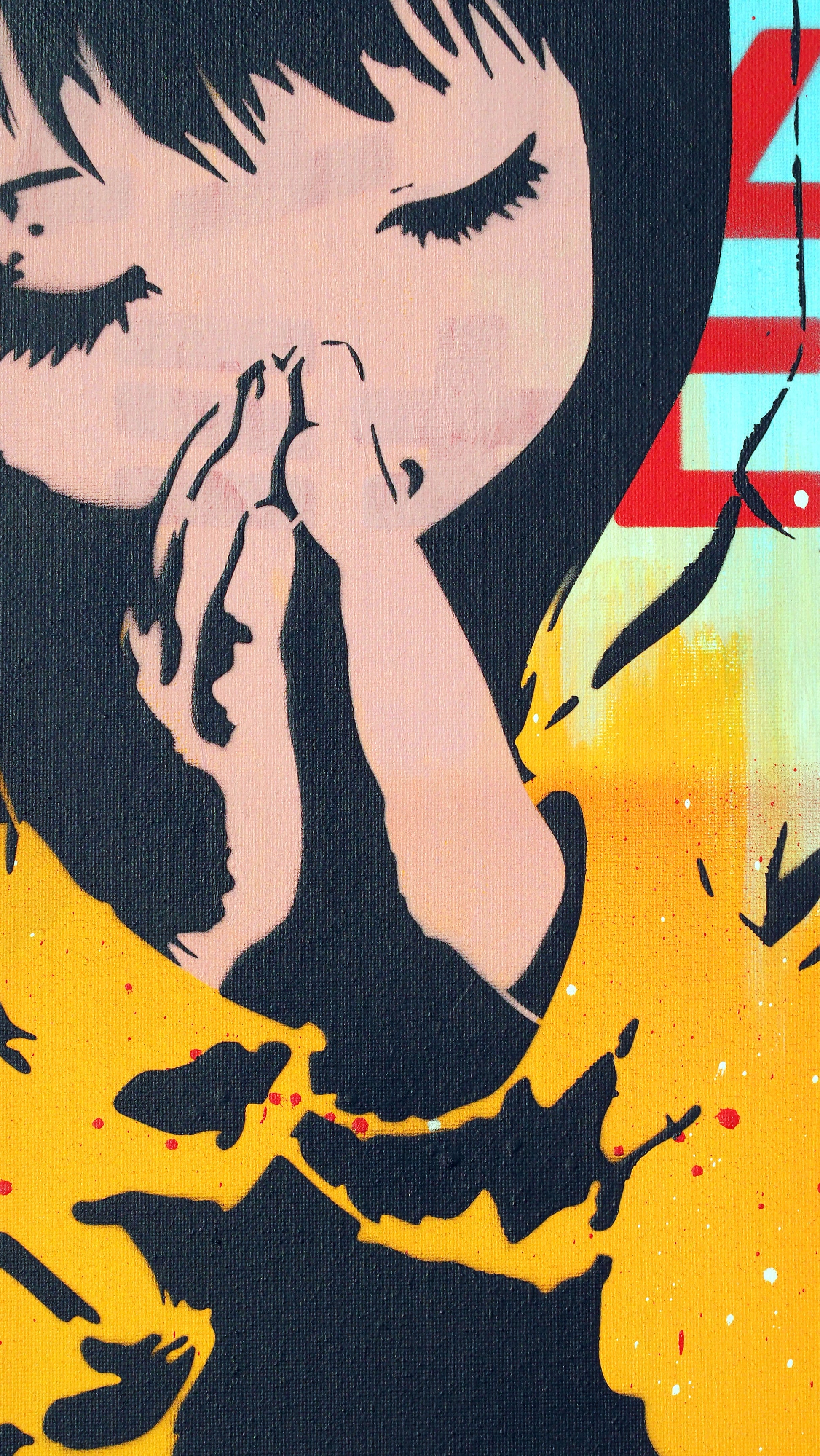 Laissez-vous envoûter par cette œuvre unique qui capture un instant de pure sérénité. Cette toile représente une jeune enfant dans une posture de recueillement ou de jeu, revisitée avec une esthétique Néo-Pop vibrante.
