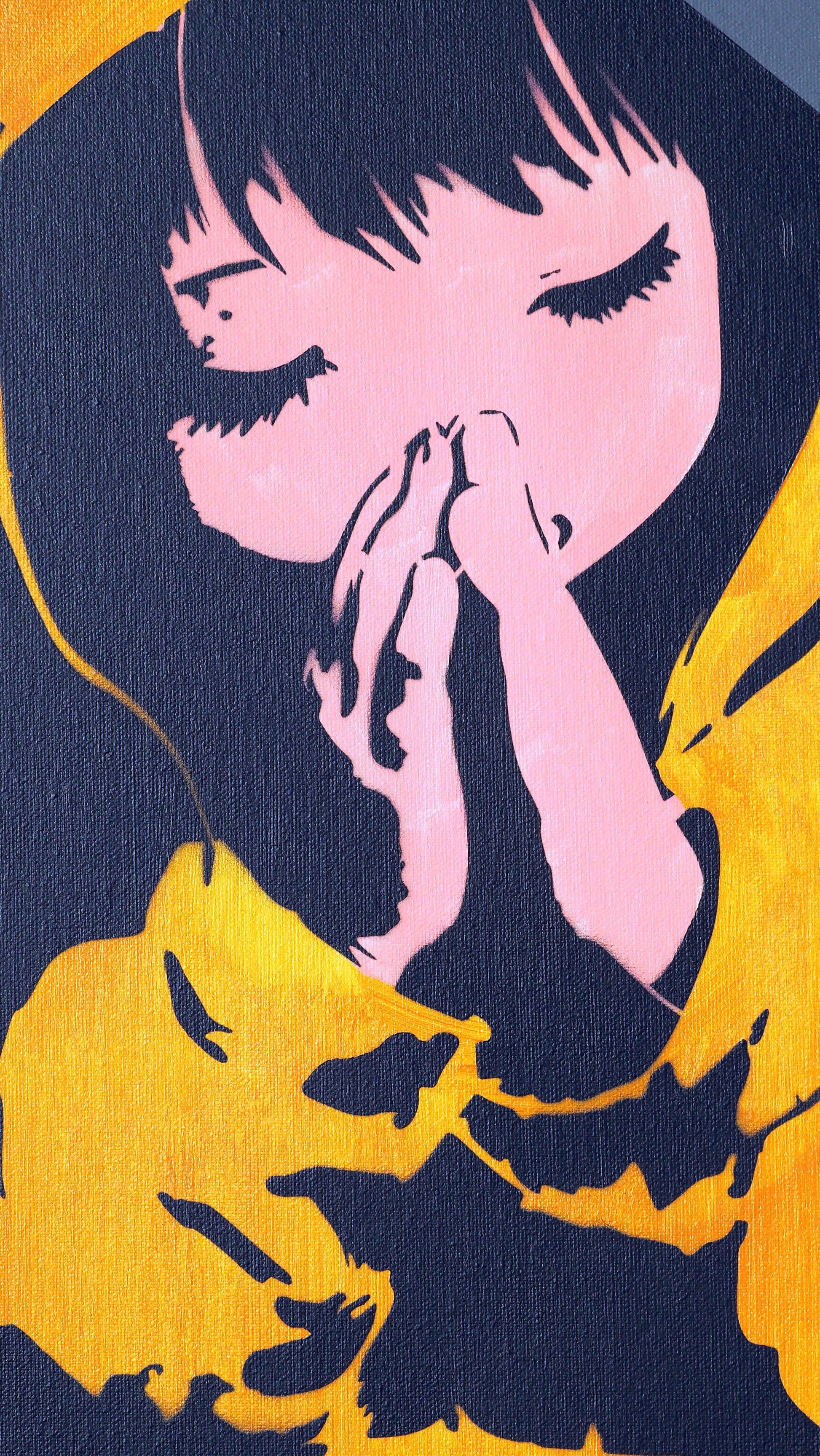 Laissez-vous captiver par la force tranquille de cette œuvre singulière. Cette toile met en scène une figure enfantine dans une posture de prière ou de méditation, enveloppée dans un sweat à capuche "panda" d'un jaune safran vibrant. Un contraste saisissant entre la paix intérieure du personnage et l'énergie explosive du Street-Art qui l'entoure.