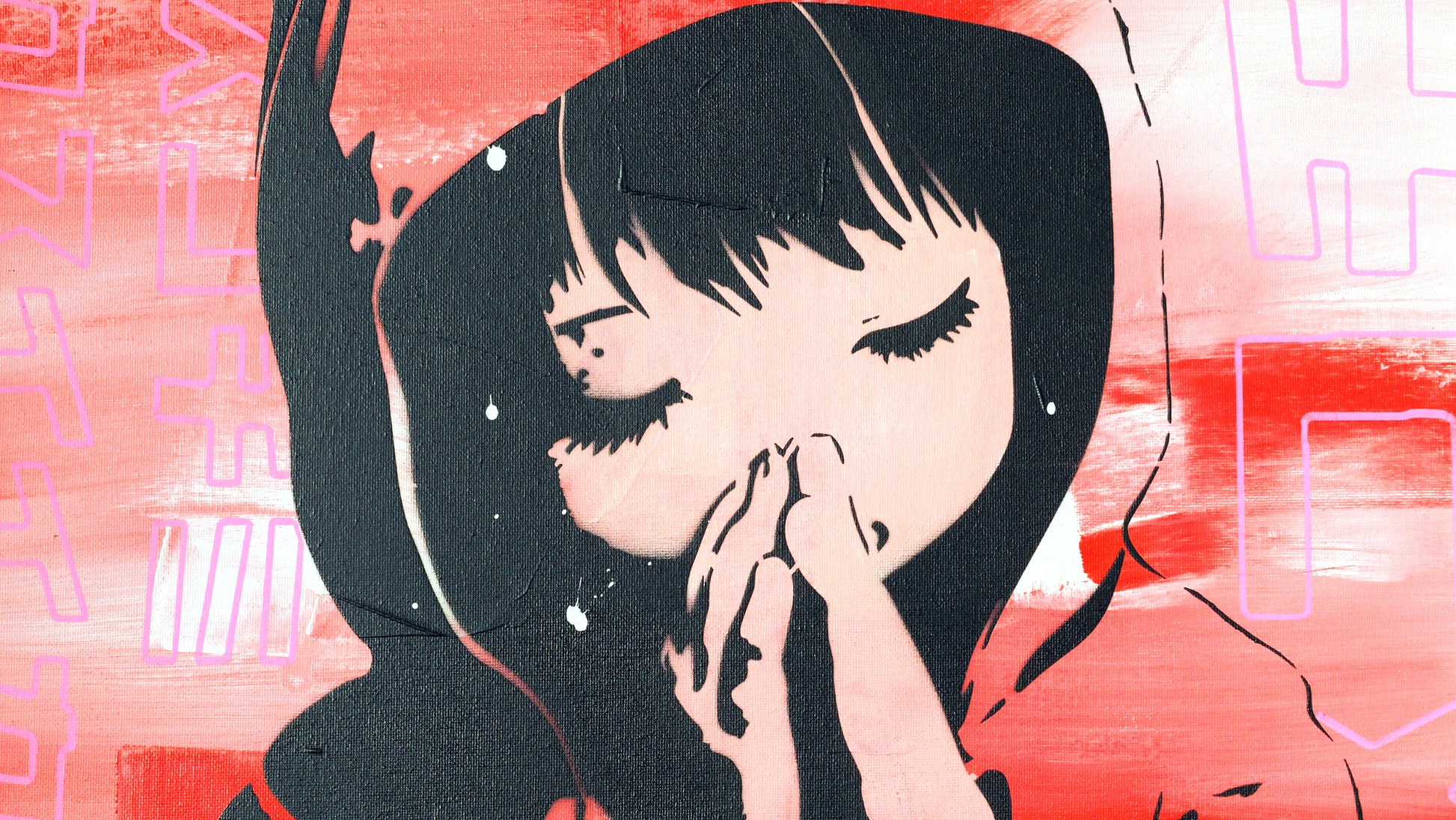 Palette : Dégradés de Rouge, Rose fluo et Noir d'encre.
