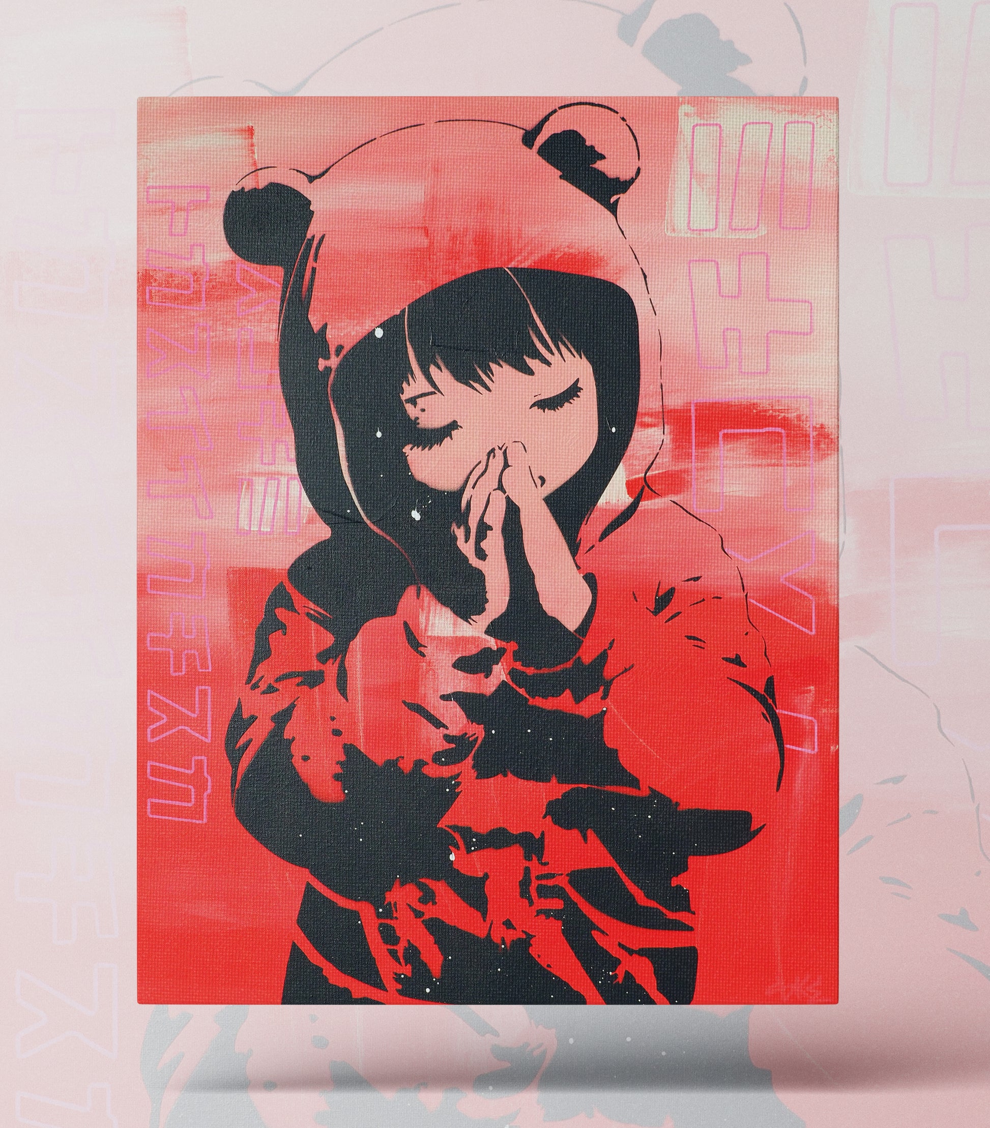 Typographie fantôme : Des caractères calligraphiques en transparence et des lettrages en contours roses s'entrelacent dans l'arrière-plan, évoquant les couches superposées des murs urbains de Tokyo.